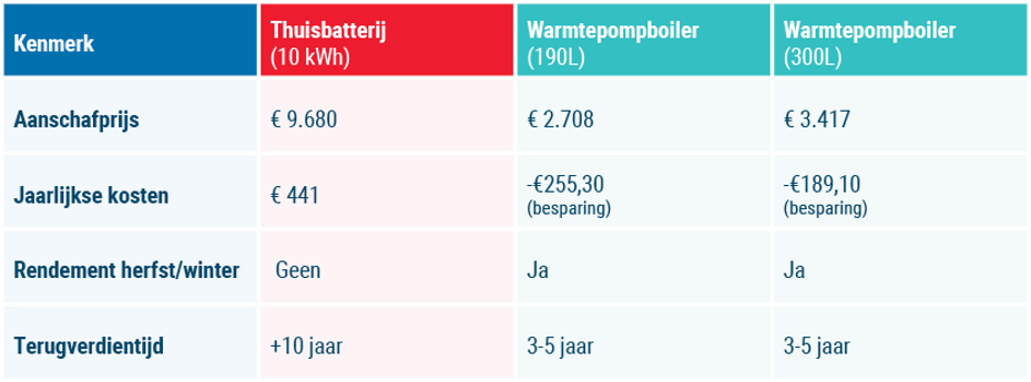 Een kwalitatieve warmtepompboiler kost tussen de €2.708 en €3.417, inclusief installatie. Dat is een stuk voordeliger dan de gemiddelde thuisbatterij van 10 kWh, die ruim €9.600 kost.